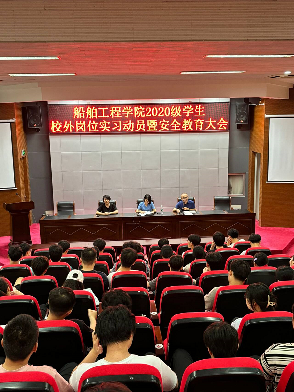 为做好20级学生校外实习各项工作,强化学生的安全意识,6月25日下午,船舶工程学院在学术报告厅召开了20级学生校外岗位实习动员暨安全教育大会。会议由学院党总支书记赵斌主持。院长吴志亚、副院长刘方、相关负责老师和20级高职高技各专业近 100名学生参加会议。