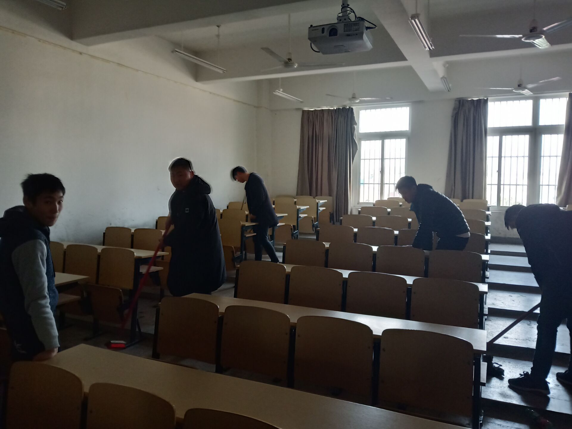 在三月份学雷锋活动月里的一个下午,班级组织一部分同学去楼上阶梯教室打扫卫生,有的教室脏的不成样子,有的教室却很干净,同学们打扫卫生却都是认真对待,一丝不苟。