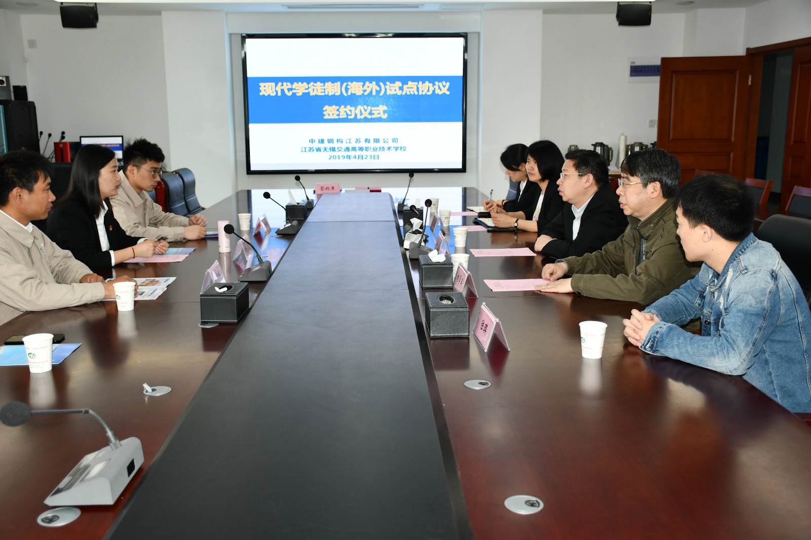 2019年4月23日上午,中建钢构江苏有限公司、开云手机客户端签订了现代学徒制(海外)试点协议。开云手机客户端党委书记李虎、学校招生就业处副处长刘学军、船舶工程学院党总支书记兼副院长吴志亚、船舶工程学院副院长刘方;中建钢构江苏有限公司党总支副书记金蕾,焊接中心主任邱明辉,焊培中心实验员缪晓泉等出席了签约仪式。