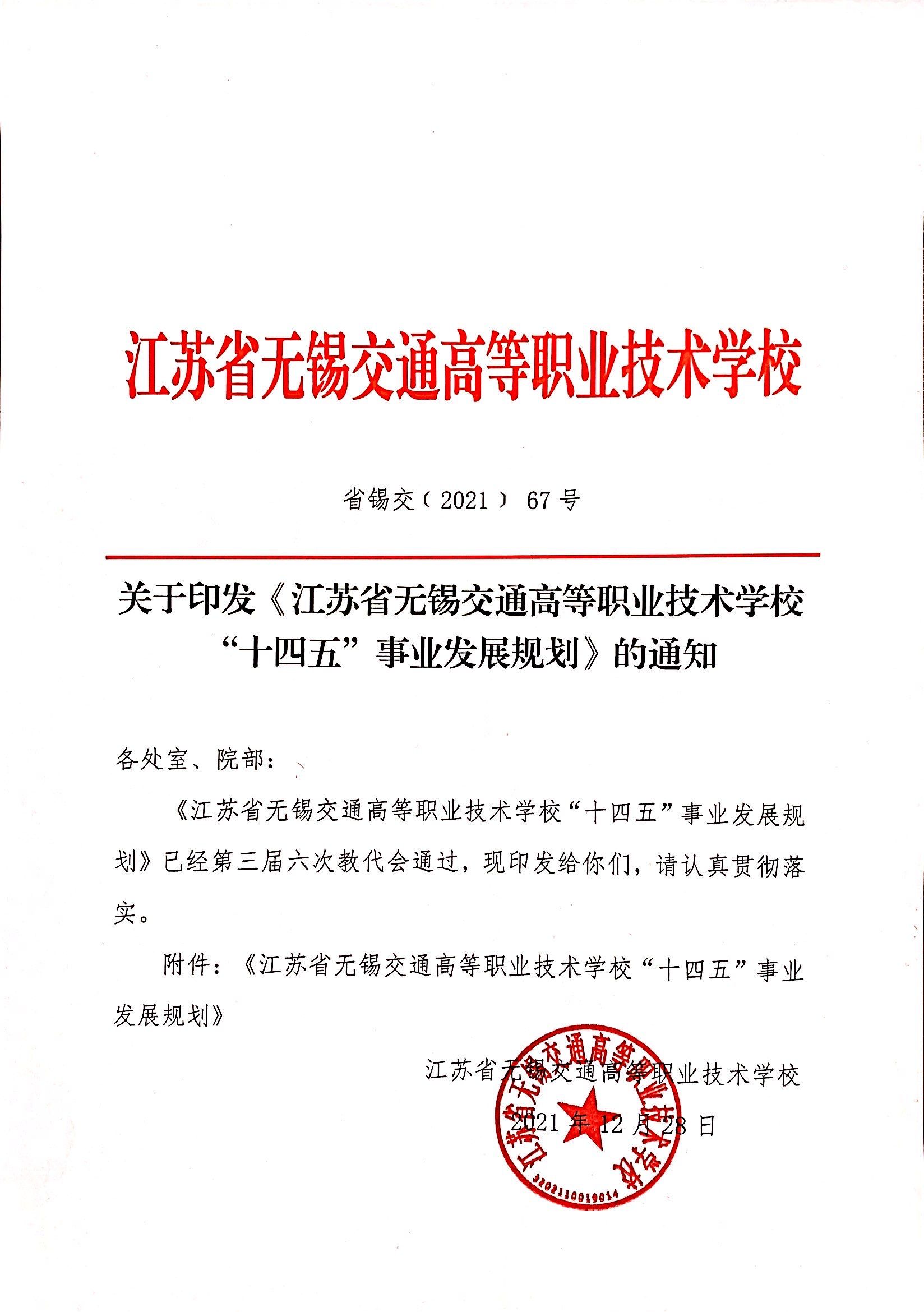 学校“十四五”发展规划立足新发展阶段,贯彻新发展理念,构建新发展格局。全校师生将在“十四五”发展规划引领下,凝心聚力、攻坚克难,狠抓落实、干事开拓,奋力开创学校改革发展新局面,为交通运输现代化示范区建设和区域经济社会发展提供更高水平的技术技能人才支撑,共同谱写学校各项事业辉煌发展的新篇章。