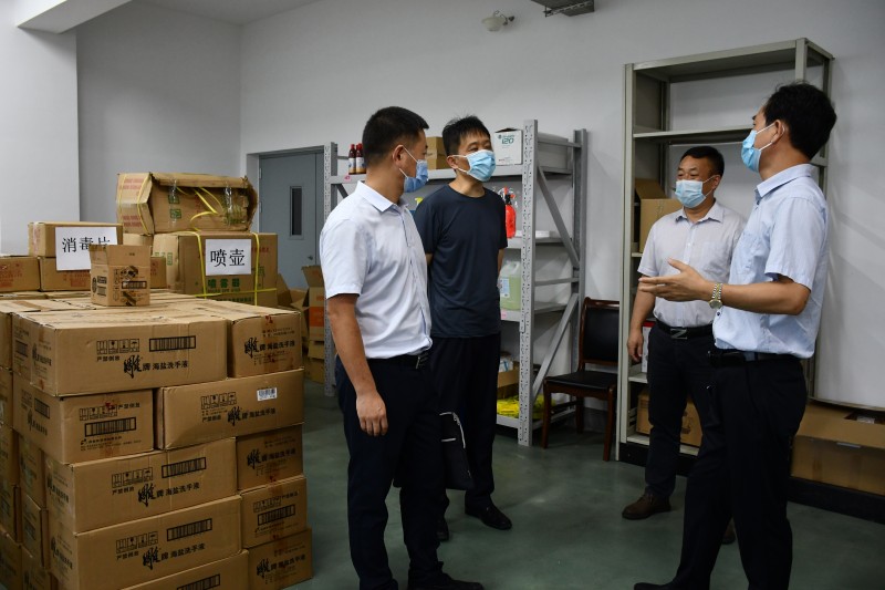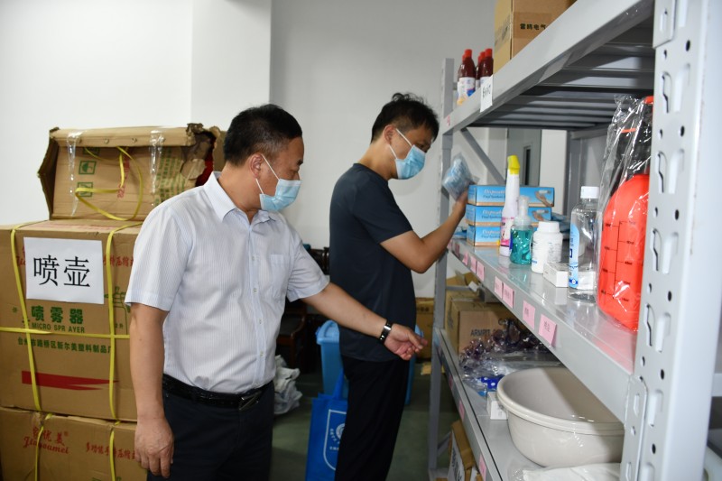 孔组长一行在学校副校长耿兴华的陪同下,实地查看了学校疫情防控工作,现场调研了学校疫情防控物资仓库,翻阅了《开云手机客户端新型冠状病毒感染的肺炎疫情防控工作方案》《学校疫情防控期间校园通风消毒及卫生工作实施方案的通知》等文件和制度。