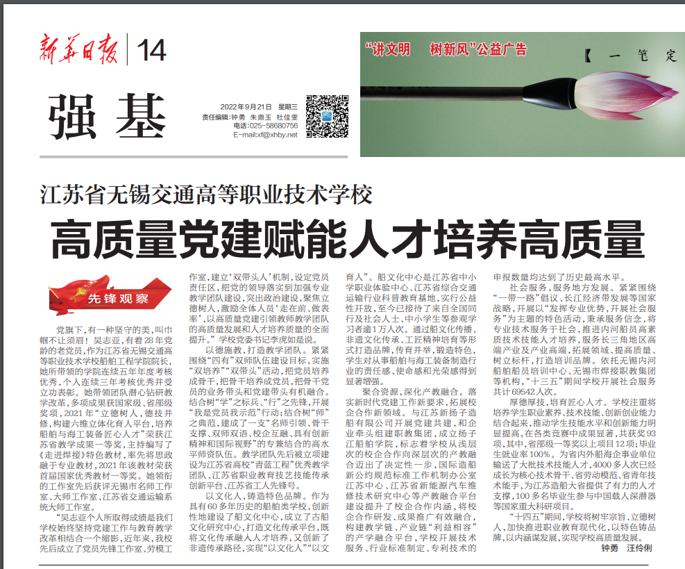 9月21日,《新华日报》专版报道无锡交校党建工作。全文如下: