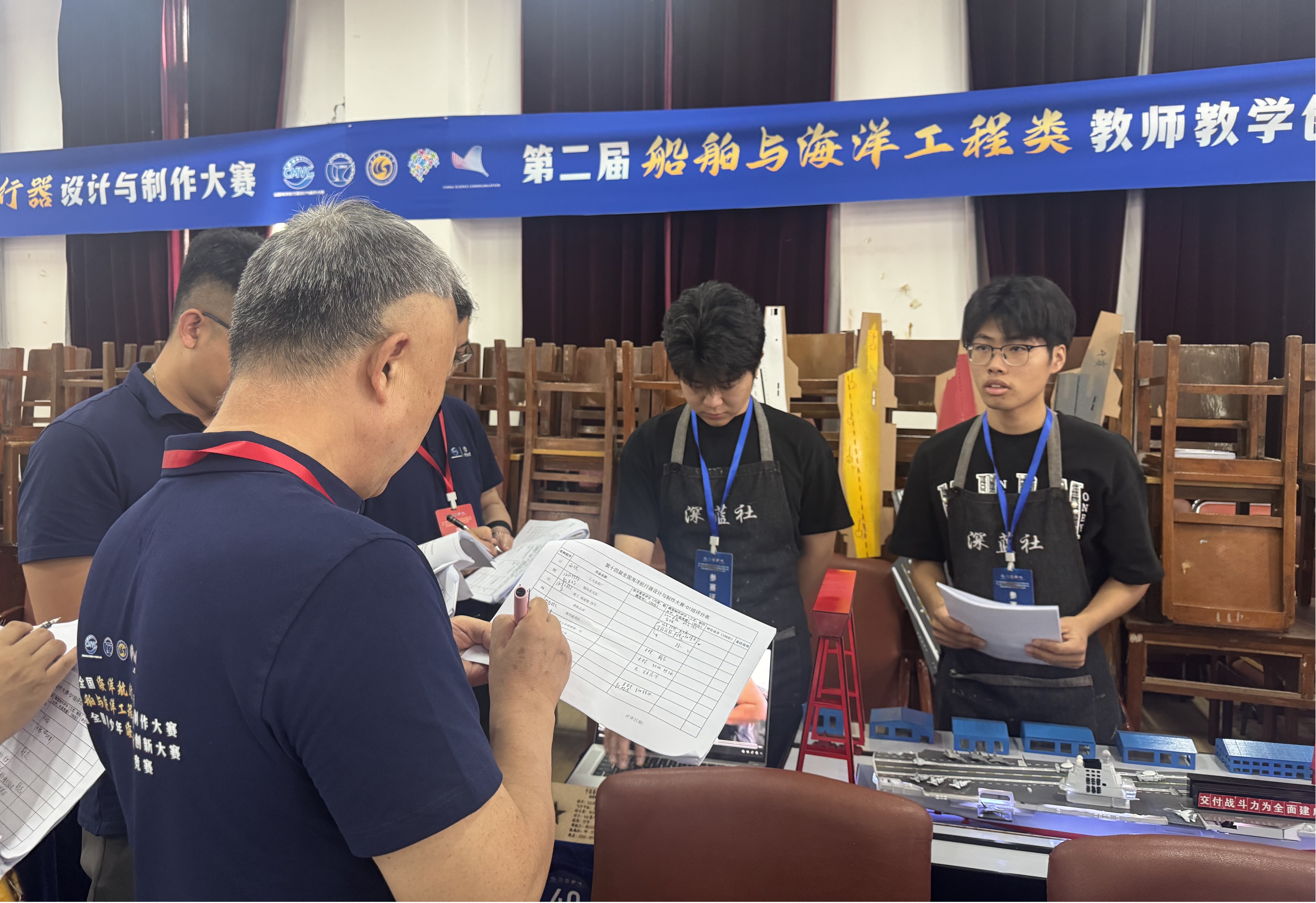 此次参赛成果的取得,离不开师生团队的协同奋战。在秦昊、万玉华两位指导教师的带领下,秦伟旻、顾焱啸、马域豪、石张浩、张天宏、尹天源、李敖、张必承等深蓝社成员自今年5月起便开启了备赛征程。盛夏的校园里,船舶工程实训中心的灯光常常亮至深夜,为了精准还原“福建舰”的结构细节,同学们顶着高温,反复查阅船舶设计图纸、研读航母技术资料,指导教师驻守实验室指导工艺优化。从图纸设计、零件切割、组装拼接,到涂装美化、性能调试,每一个环节都凝聚着师生的汗水…… 正是这份“精益求精、迎难而上”的执着,为最终的获奖奠定了坚实基础。