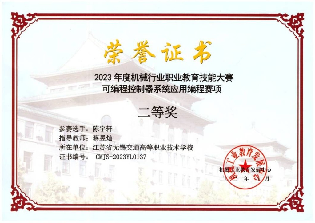 202346-8号,2023年全国机械行业职业教育技能大赛可编程控制器系统应用编程赛项在南京工业职业大学举行,此次大赛全国共有150支队伍参赛。机电工程学院211324班陈宇轩同学代表学校参赛,经过激烈角逐,获中职组二等奖。