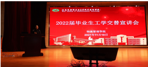 2021年11月10日下午,物流管理学院2022届毕业生工学交替企业宣讲活动在学校大礼堂顺利召开。学院副院长江玉婷主持活动。副书记张龙枝老师,我院2022届毕业班班主任和毕业班全体同学参加了此次活动。