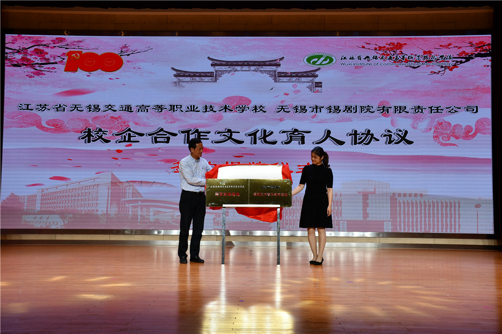 开幕式上,耿兴华副校长和无锡市锡剧院徐俊副院长签订学校与无锡市锡剧院开展“锡剧文化进校园”校企合作协议并揭牌。为学校增挂“锡剧艺术普及教育基地”、 同时为戏剧院增挂“美育实践基地”。此举通过打造地方戏剧文化学习宣传普及基地,弘扬锡剧艺术,传承优秀地方文化,也进一步加强学校美育工作。