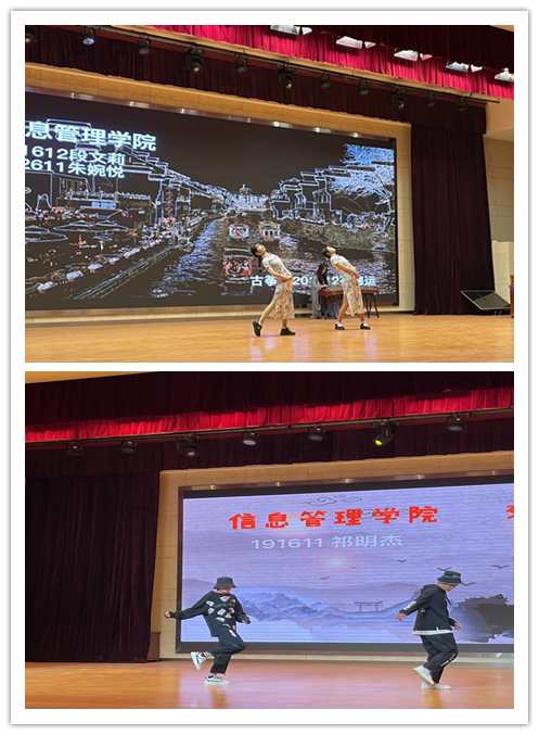 比赛精彩纷呈,有街舞、民族舞、现代舞等多个舞种。信息管理学院同学们带来的《夜泊秦淮》,柔美的舞姿配合绵柔委婉的古风歌曲如水墨般清新,婀娜的舞姿柔美中又不失力量。舞蹈《华》,强烈的节奏、高难度的动作、激昂的音乐在配上青春洋溢的装扮更是将全场的气氛推向高潮。经过两小时的激烈角逐,学院的《华》获得了二等奖,《夜泊秦淮》获得了三等奖。