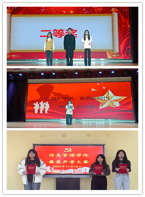 为激发青年一代的爱国情怀,给学生搭建一个展示自我的平台。学校于11月11日下午3:10分在大礼堂举行了校园文化艺术节之“青春歌献祖国”校园好声音决赛,信息管理学院三名同学参加决赛。