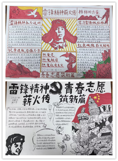 同学们积极参与,把对雷锋同志的崇敬与怀念之情投入到创作之中。从深入挖掘雷锋事迹、广泛搜集资料,到排版设计、内容撰写,每一个细节都倾注了心血。有些作品聚焦雷锋生平,以图文并茂的形式展现其成长轨迹;有的作品则着重展现新时代雷锋精神,记录身边的好人好事……这些作品主题鲜明,内容丰富多彩,板式新颖多样,字迹工整清晰,充分展示了同学们对雷锋精神的所思所想、所感所悟。传统与创新碰撞,严肃与灵动交织,让雷锋精神的丰富维度在方寸画卷间蓬勃生长。经过激烈角逐,获奖名单如下: