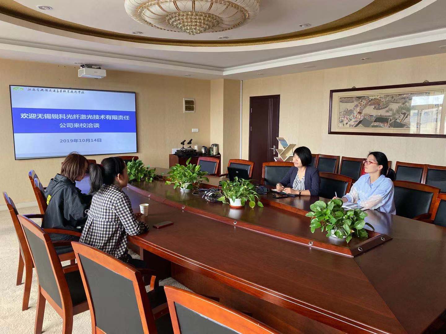 20191014日,无锡锐科光纤激光技术有限责任公司人力资源部陆娜、何媛来校洽谈校企合作及招聘事宜。船舶工程学院党总支书记吴志亚和学工办干事何旭丹进行了接待工作。双方就校企合作方式及具体事项展开了深入交流。