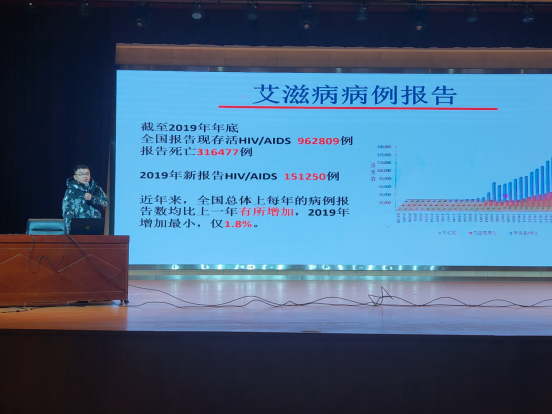 艾滋病主要通过性、血液途径、母婴传播,是传染病中死亡率最高的一种,艾滋病疫情十分严峻,防治工作任重道远。成浩主任通过详实的资料、丰富的案例和专业的医学解读、互动,给大家上了一堂深动的防艾课,使与会师生不仅仅从医学的角度认识、了解了艾滋病,更从内心的深处增强了预防艾滋病从我做起的意识,更形成了“预防艾滋 人人有责”的共识。