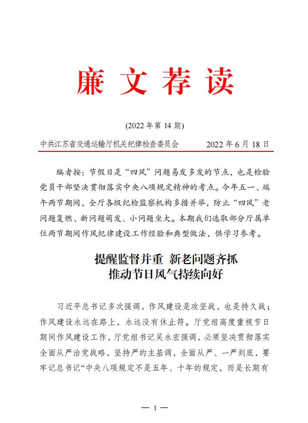 2022年廉文荐读第14期——提醒监督并重 新老问题齐抓 推动节日风气持续向好