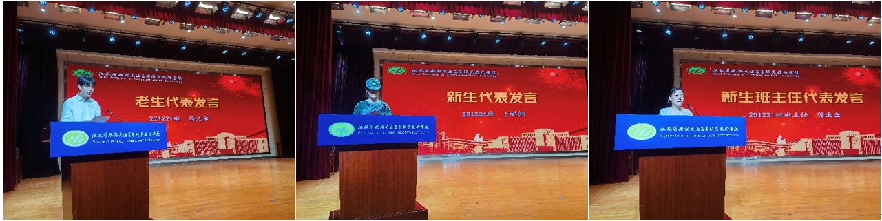 邀请221221班学生杨光浩同学代表老生发言,杨光浩同学从自身的感受告诫学弟、学妹们要树立远大理想,坚定信念,锤炼技能。新生代表251231班王科然同学代表全体新生,怀揣着对未来的信心,明确了日后学习的目标,提出了新征程学习生涯的规划。251221班班主任蒋金金老师代表新生班主任发言,她说班主任是同学们前行的引路者,是同学们的大家长,希望和同学们一起走向成功。