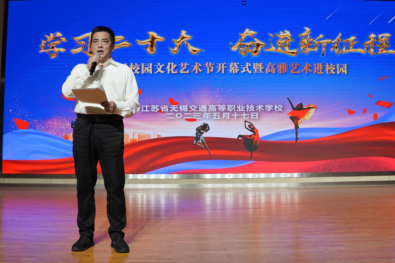 为进一步学习贯彻党的二十大精神,加强校园文化建设,营造积极健康、高雅文明的校园人文环境。517日,学校第届校园文化艺术节开幕式暨高雅艺术进校园活动隆重举行。江苏省交通运输厅团委书记钱京江,校党委书记、校长李虎,校党委委员、副校长耿兴华、校纪委书记邢勇、副校长范次猛出席此次活动。开幕式由校党委委员、副校长倪依纯主持。