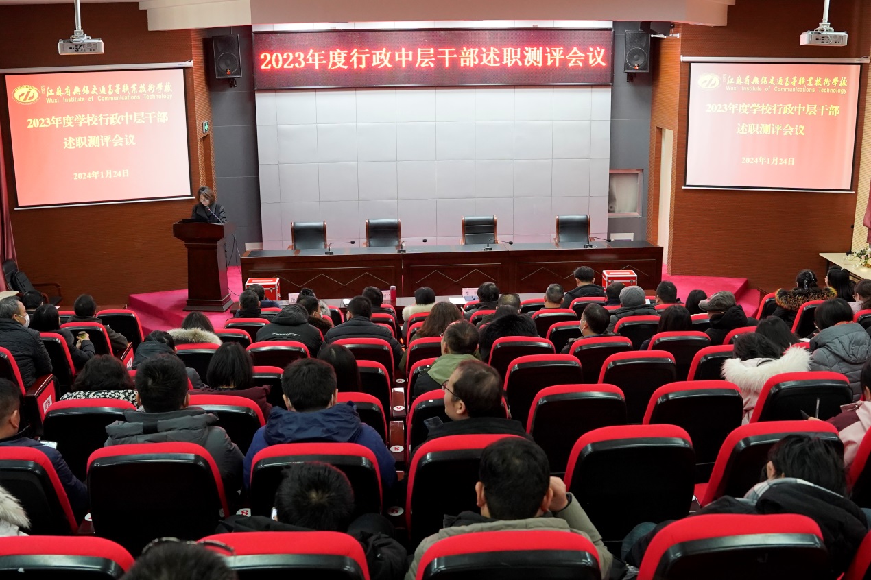 为深化学校中层干部队伍建设,持续提升学校管理能力和行政服务质量,1月24日上午,学校在学术报告厅召开2023年度行政中层干部述职测评会议。学校全体校领导、全体中层干部、院部教师代表、行政处室管理人员代表120余人参加了此次会议,会议由校党委副书记、五级职员朱雨兰主持。